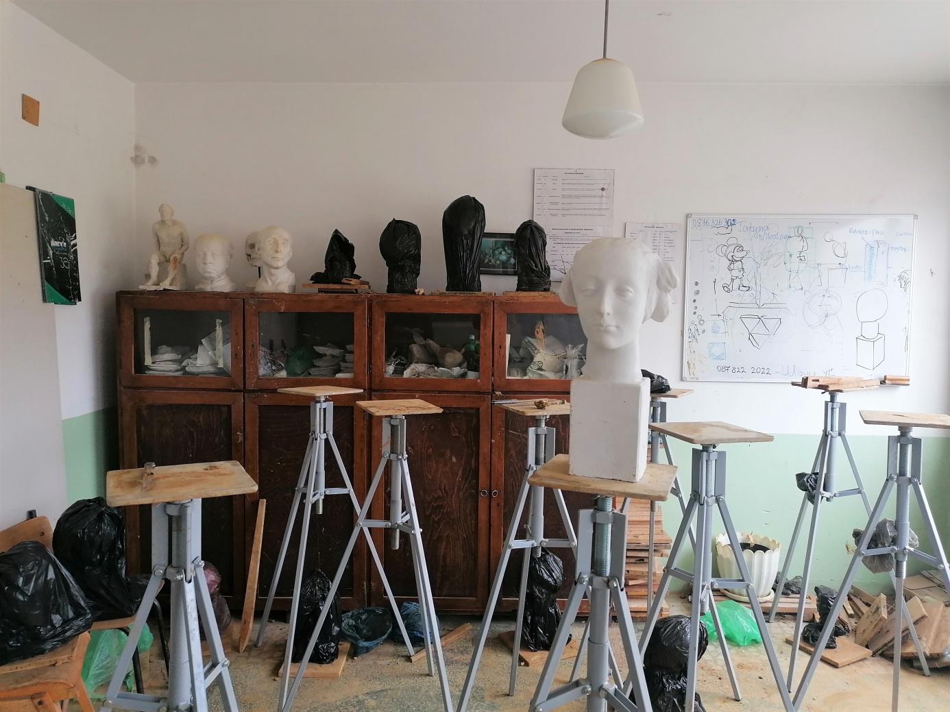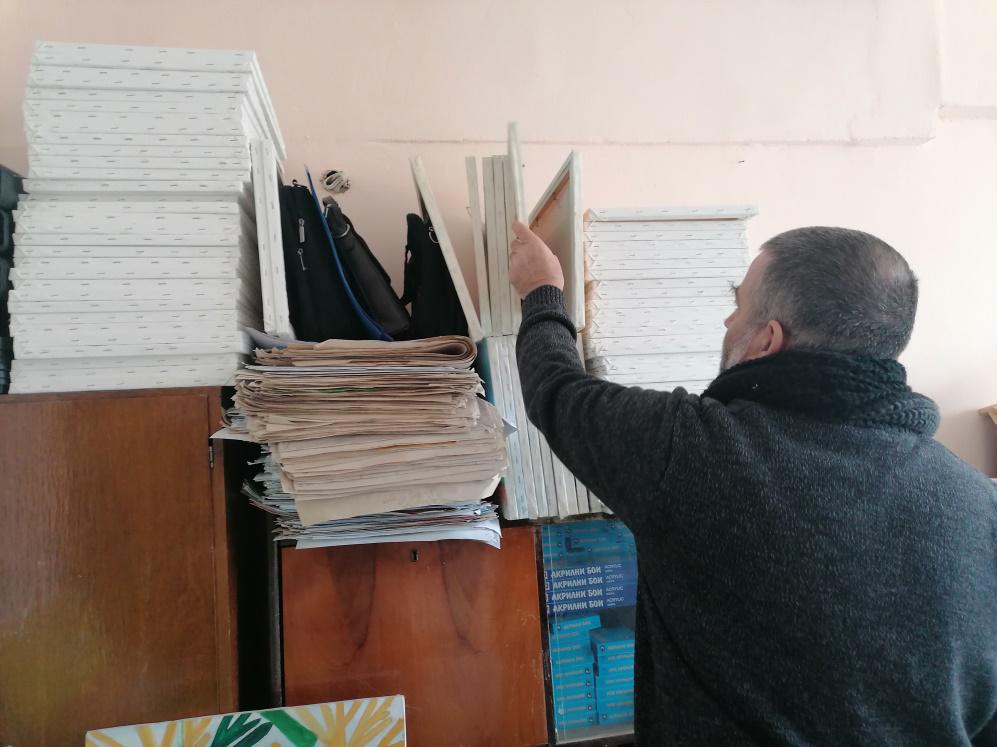 До студиото за рисуване и визуални изкуства има стая, използвана за склад. Там има всичко, което служи за теория и практика на изкуството: учебници, справочници, четки, тушове, бои, хартия, платна, включително магнетофонен апарат от 60-те години на миналия век. Димитър обяснява, че го е донесъл, защото „те трябва да знаят какво е това, как се е работело с него, защото сега в часовете за фотография те снимат с телефоните си”. По същата логика те изучават и история на изкуството (в четири тома), както и „Цивилизацията” на Кенет Кларк, както и вида на шевиците.